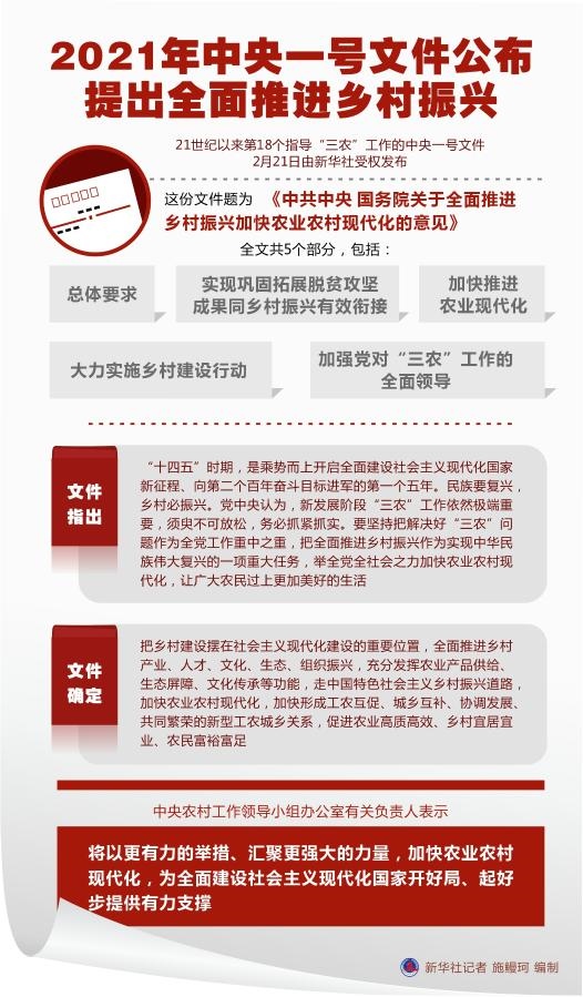 這份文件題為《中共中央 國務(wù)院關(guān)于全面推進鄉(xiāng)村振興加快農(nóng)業(yè)農(nóng)村現(xiàn)代化的意見》,全文共5個部分,包括:總體要求、實現(xiàn)鞏固拓展脫貧攻堅成果同鄉(xiāng)村振興有效銜接、加快推進農(nóng)業(yè)現(xiàn)代化、大力實施鄉(xiāng)村建設(shè)行動、加強黨對“三農(nóng)”工作的全面領(lǐng)導(dǎo)。