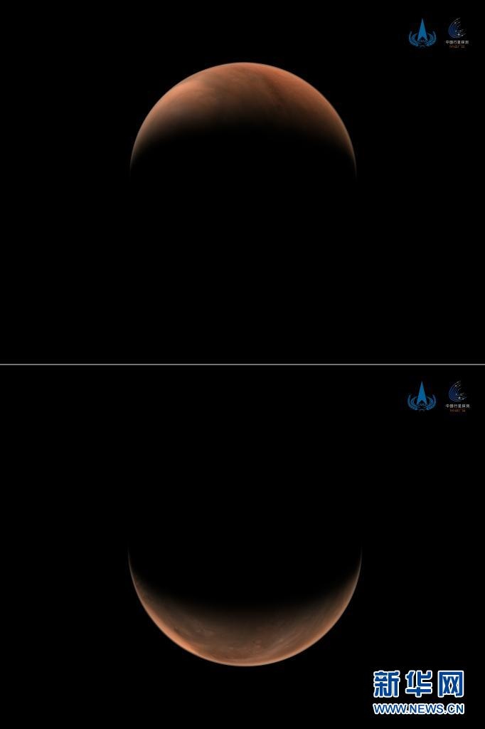 2021年3月26日,國家航天局發(fā)布2幅由我國首次火星探測任務(wù)天問一號探測器拍攝的南、北半球火星側(cè)身影像。這是一張拼版照片,上圖為:北半球上方火星影像;下圖為:南半球上方火星影像?! ?/p>