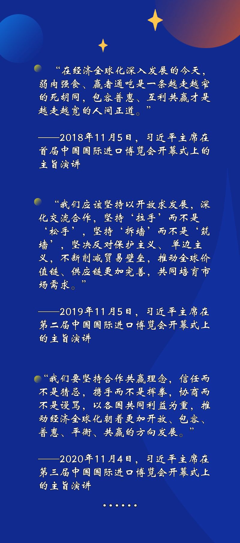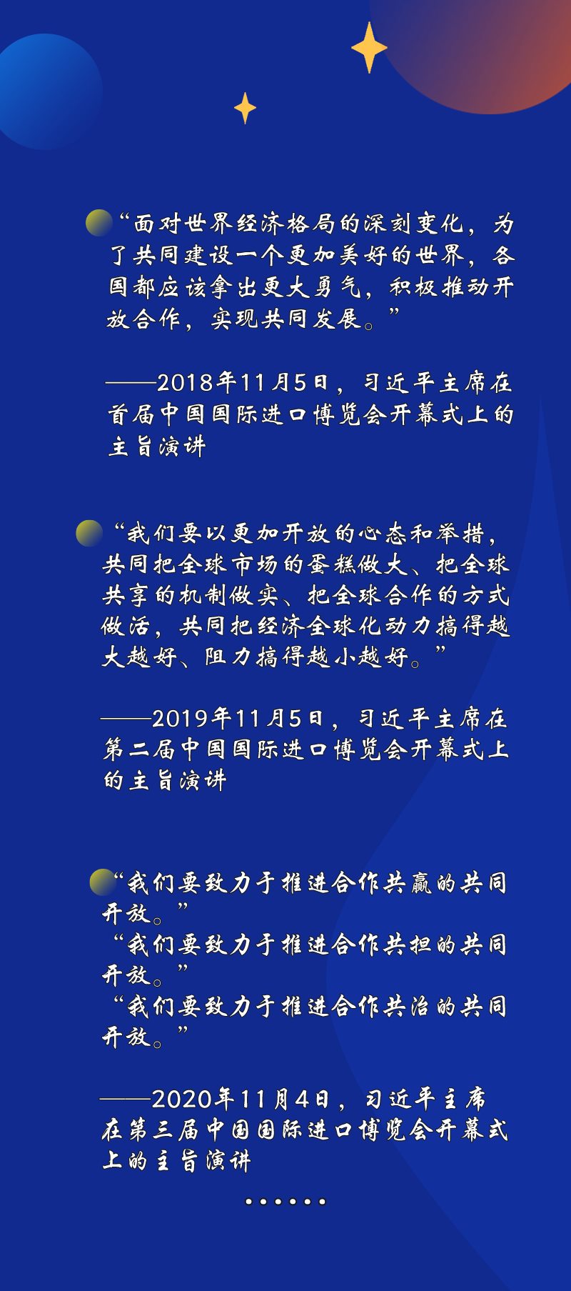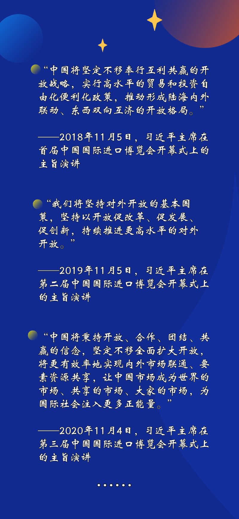 “持續(xù)放寬市場準入”“繼續(xù)優(yōu)化營商環(huán)境”“深化雙邊、多邊、區(qū)域合作”……習近平主席在進博會上宣布中國擴大開放的一系列重大舉措。