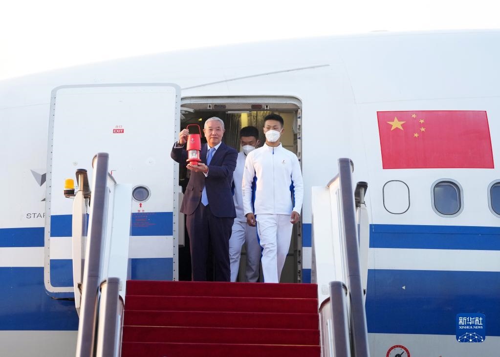 10月20日,在北京首都機場,北京冬奧組委特別代表、北京冬奧組委副主席于再清(左)手持火種燈走出艙門。隨著北京冬奧組委赴希臘代表團抵達(dá)首都機場,北京冬奧會火種順利抵達(dá)北京。新華社記者 張晨霖 攝