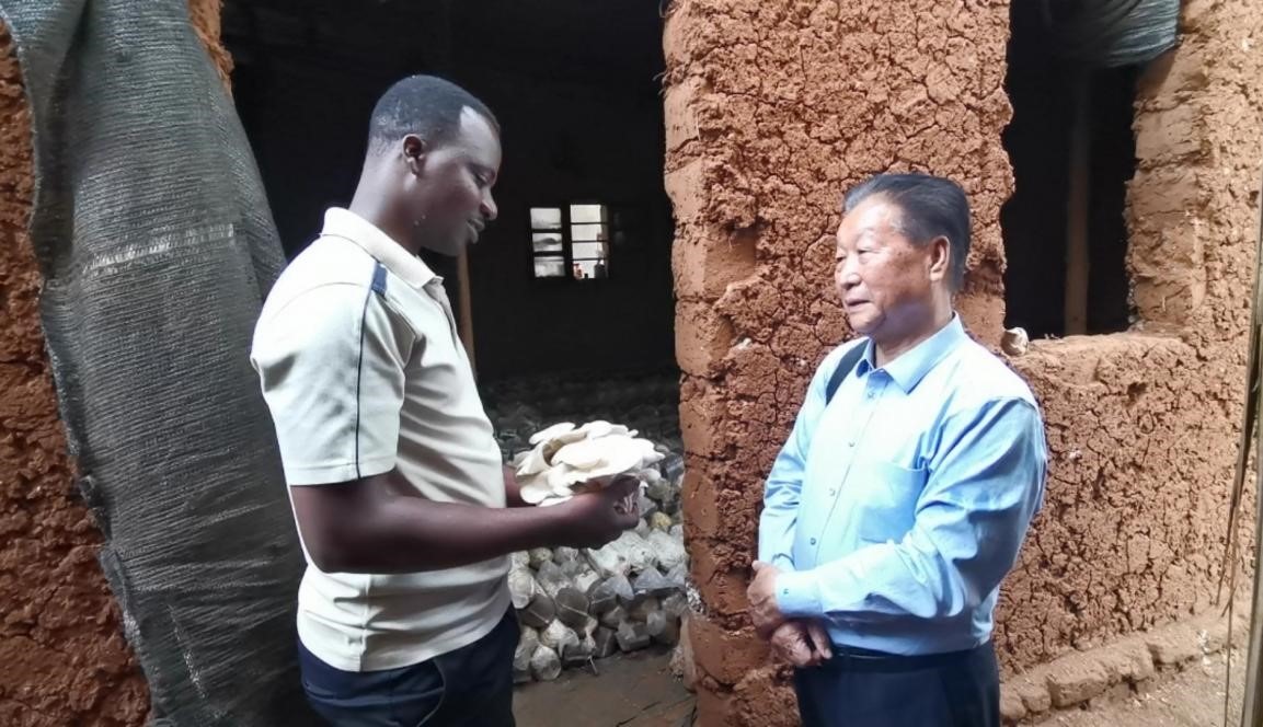 2019年,林占熺在盧旺達(dá)指導(dǎo)當(dāng)?shù)剞r(nóng)戶菌草種菇。圖片來源:國家菌草工程技術(shù)研究中心