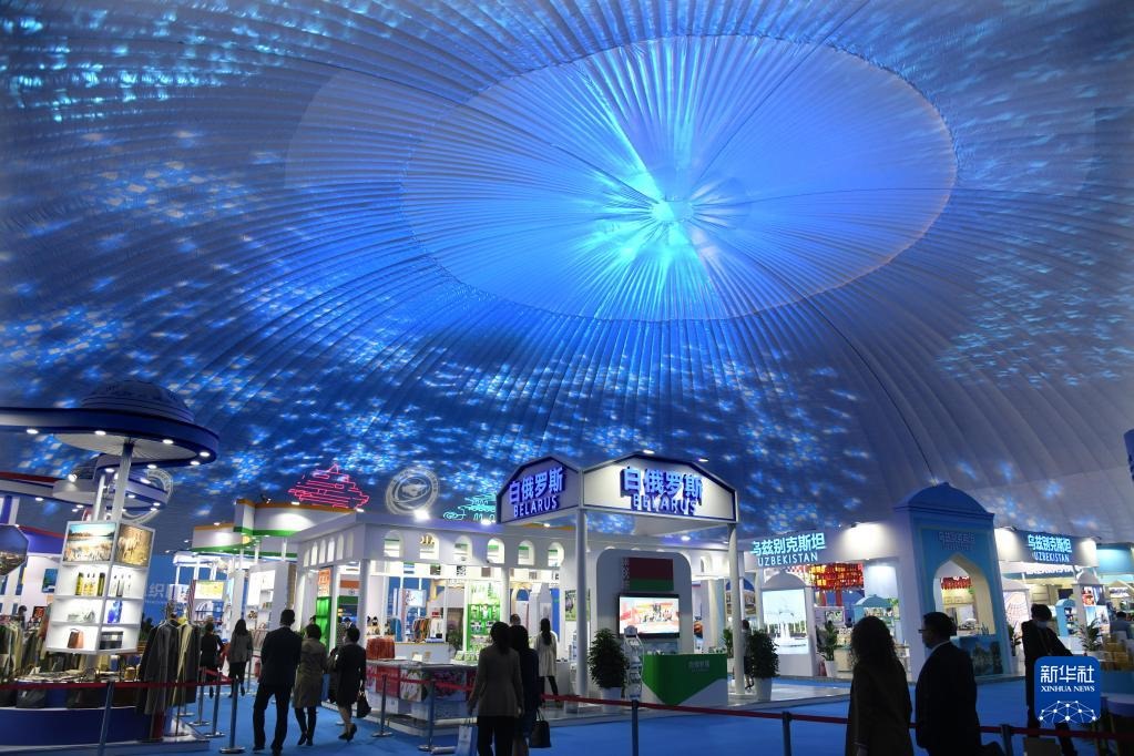 與會(huì)嘉賓在各國形象館展區(qū)參觀(2021年4月26日攝)。當(dāng)日,2021上海合作組織國際投資貿(mào)易博覽會(huì)暨上海合作組織地方經(jīng)貿(mào)合作青島論壇在青島開幕。新華社記者 李紫恒 攝