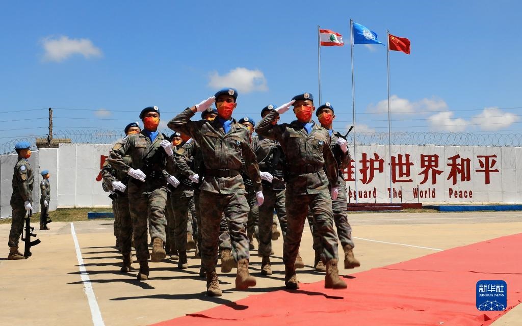 在黎巴嫩南部辛尼亞村的中國維和部隊(duì)營區(qū),中國維和部隊(duì)官兵在受勛后通過觀禮臺(2022年7月1日攝)。新華社記者 劉宗亞 攝