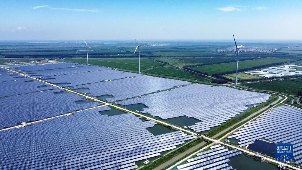 這是在天津市寧河區(qū)寧河鎮(zhèn)大月河村拍攝的110千伏大月河光伏電站(2022年7月18日攝,無人機(jī)照片)。新華社記者 孫凡越 攝