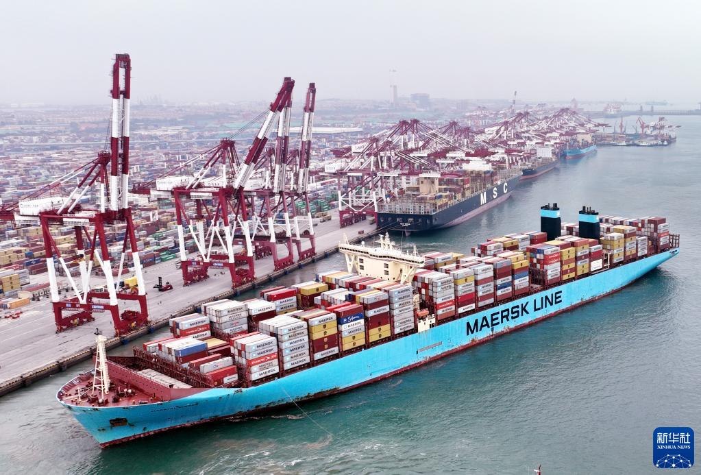 在山東港口青島港前灣碼頭,歐洲貿(mào)易航線的“美途馬士基”集裝箱貨輪解纜起航(2022年7月29日攝,無人機照片)。新華社記者李紫恒攝