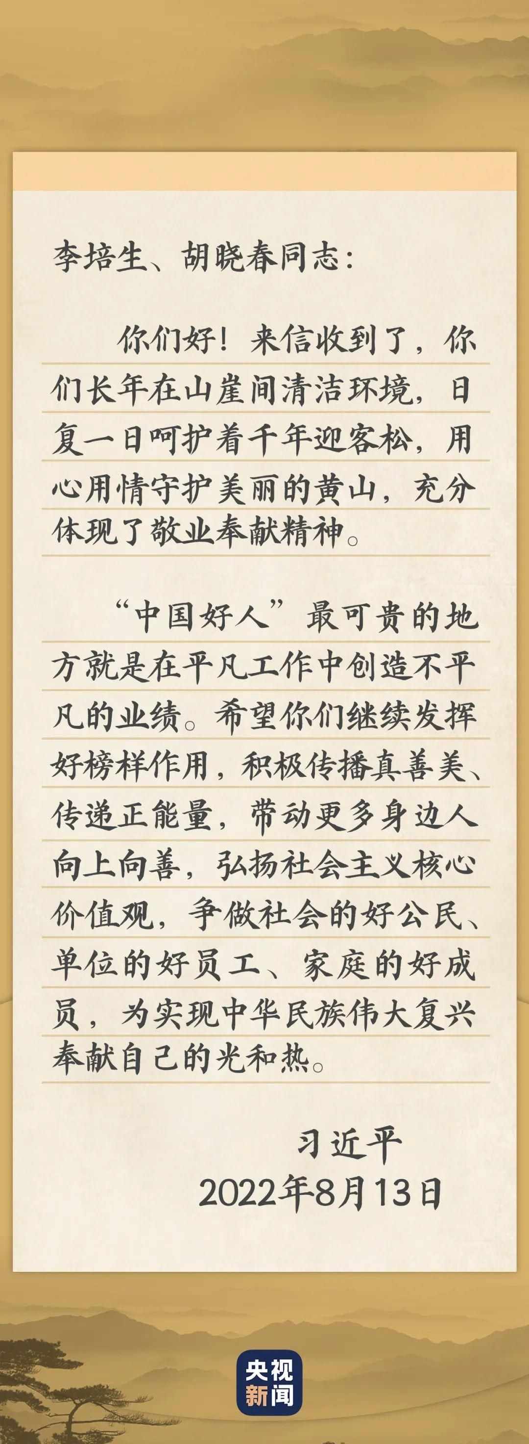 黃山之巔,迎客松畔。雙手接過總書記的回信,“中國好人”李培生和胡曉春熱淚盈眶。