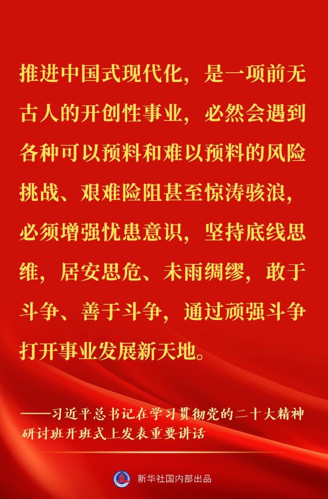 新進(jìn)中央委員會(huì)的委員、候補(bǔ)委員和省部級(jí)主要領(lǐng)導(dǎo)干部學(xué)習(xí)貫徹習(xí)近平新時(shí)代中國(guó)特色社會(huì)主義思想和黨的二十大精神研討班7日上午在中央黨校(國(guó)家行政學(xué)院)開(kāi)班。中共中央總書(shū)記、國(guó)家主席、中央軍委主席習(xí)近平在開(kāi)班式上發(fā)表重要講話。一起來(lái)看金句↓