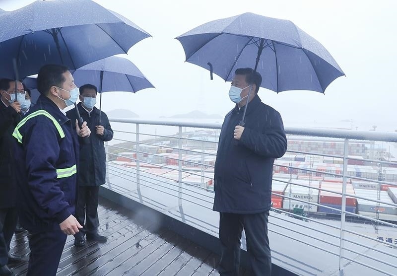 △2020年3月29日,習(xí)近平總書記在浙江寧波舟山港考察調(diào)研??疾旆稻┎蛔?0天,總書記在中央財(cái)經(jīng)委員會(huì)第七次會(huì)議上,首次提出構(gòu)建新發(fā)展格局。