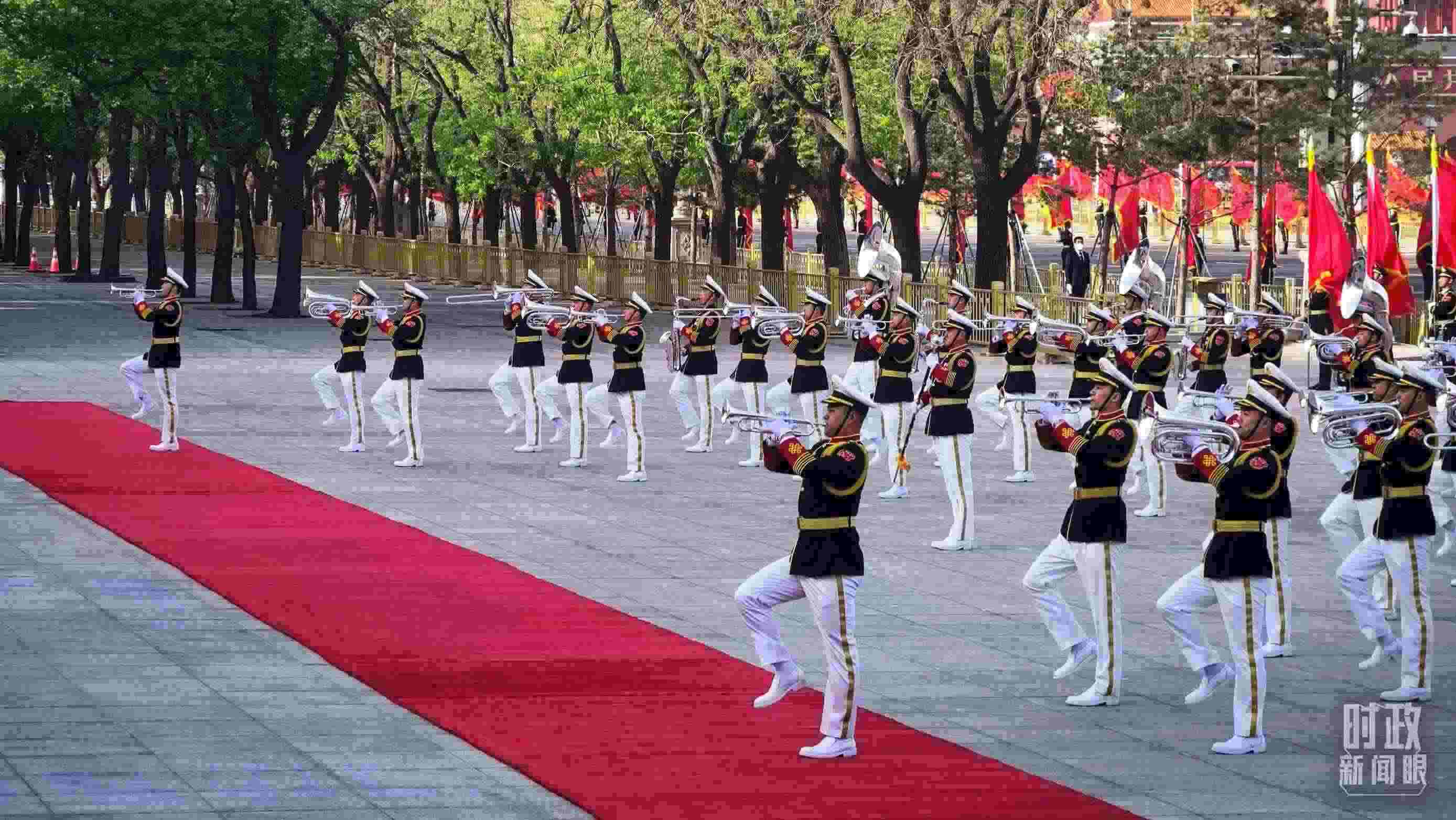 △歡迎儀式現(xiàn)場的軍樂團(tuán)正在進(jìn)行行進(jìn)吹奏表演。(總臺央廣記者潘毅拍攝)
