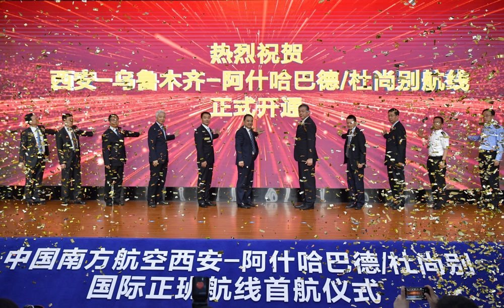 西安-阿什哈巴德/杜尚別國(guó)際正班航線首航儀式在西安舉行(5月13日攝)。新華社記者 邵瑞 攝