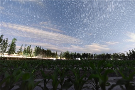 △新疆巴州和靜縣哈爾莫敦鎮(zhèn)查茨村高標準農(nóng)田防護林的夏日星空夜景