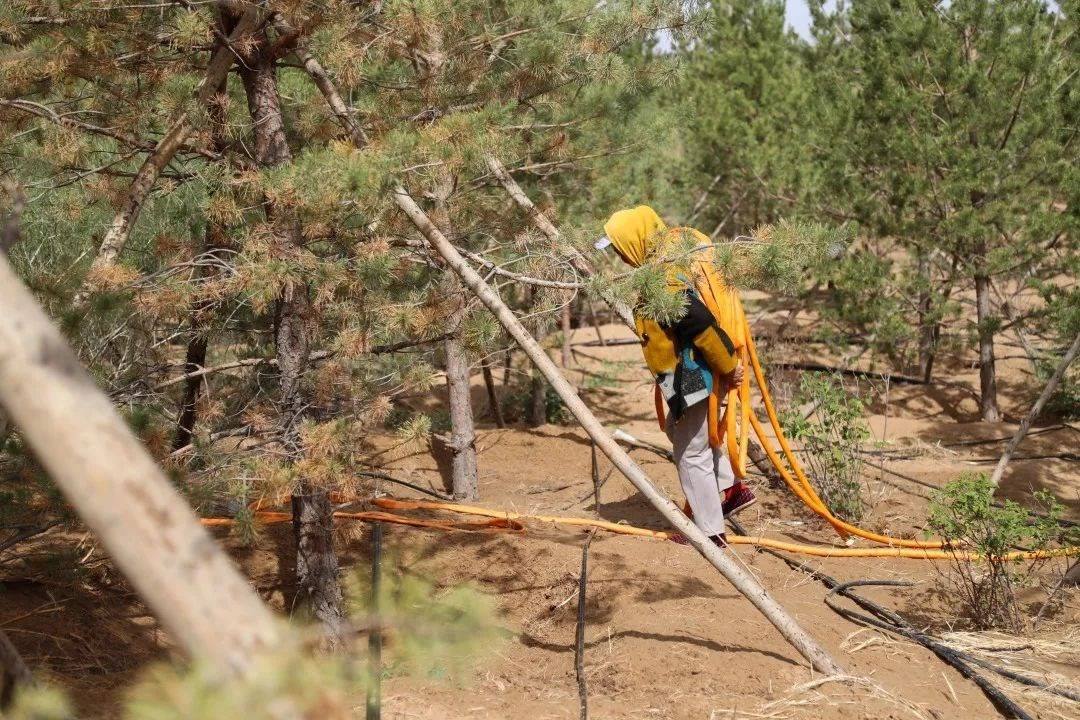 △2023年5月31日,治沙工人在庫布其沙漠億利生態(tài)治理區(qū)內(nèi)搬運水管,準備為樹木澆水。