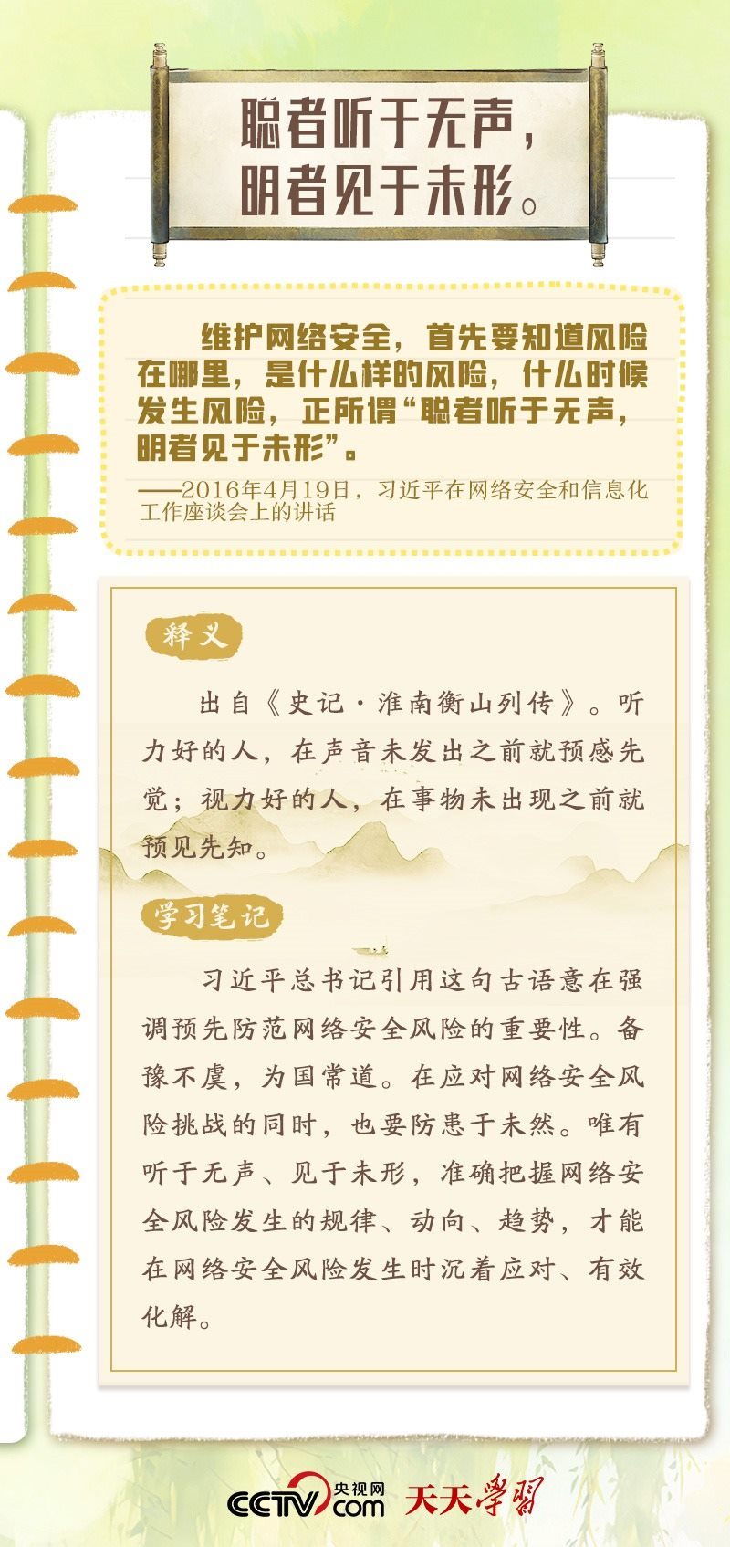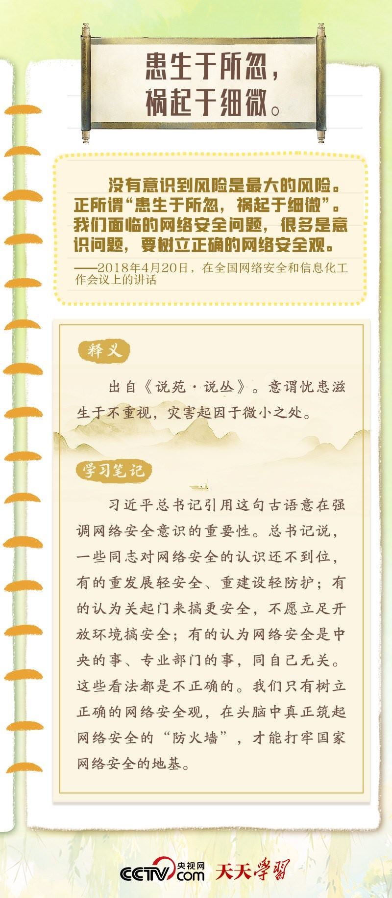 習(xí)近平總書(shū)記重視網(wǎng)絡(luò)安全工作,曾多次在講話(huà)中以典明理,深刻闡釋網(wǎng)絡(luò)安全工作的重要意義?!熬W(wǎng)絡(luò)安全宣傳周”到來(lái)之際,央視網(wǎng)《天天學(xué)習(xí)》特梳理總書(shū)記關(guān)于網(wǎng)絡(luò)安全的用典,與您一起學(xué)習(xí)領(lǐng)悟。