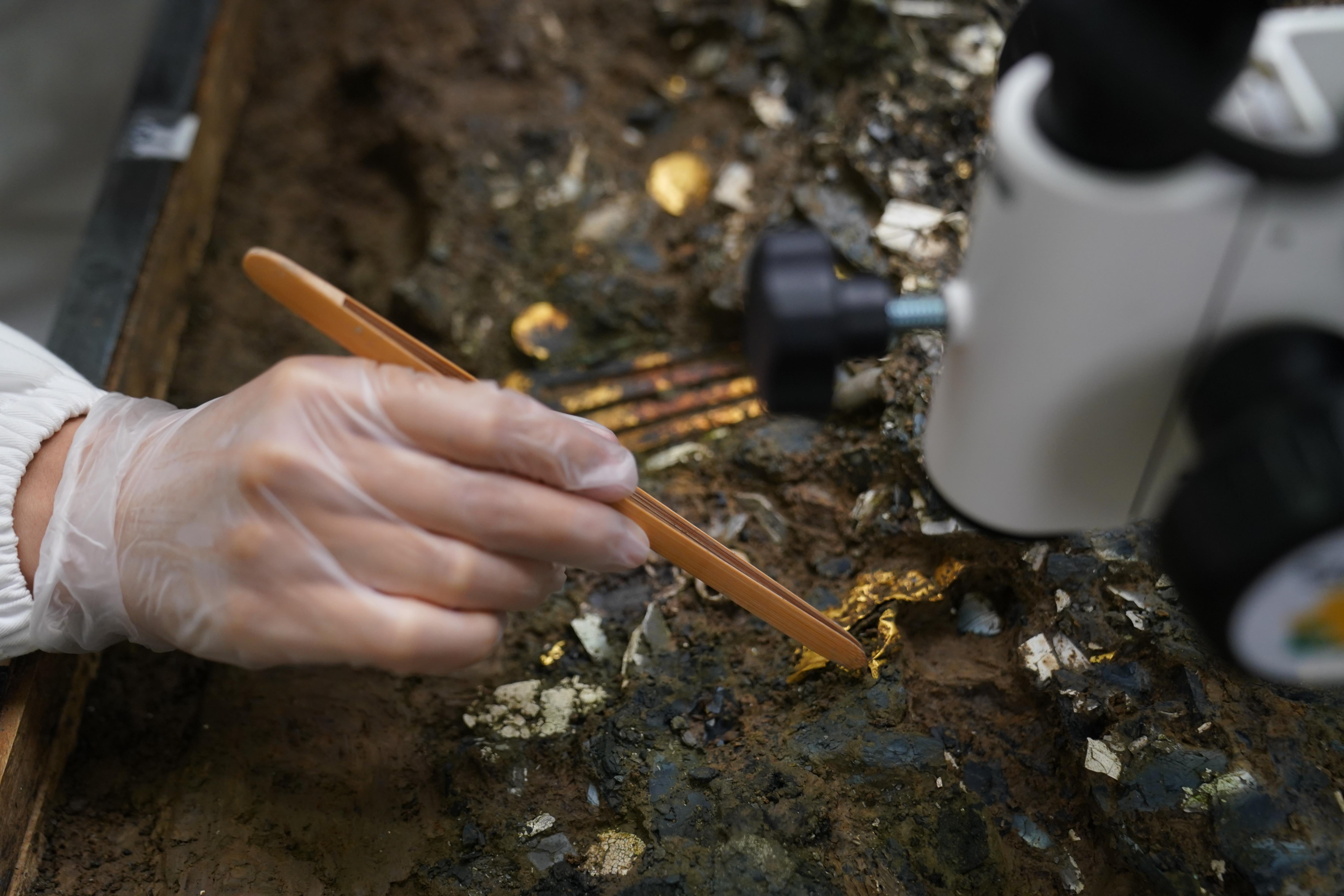 △三星堆博物館文物保護修復館內,三星堆文物修復人員正在對出土文物進行清理。(總臺國廣記者李晉拍攝)