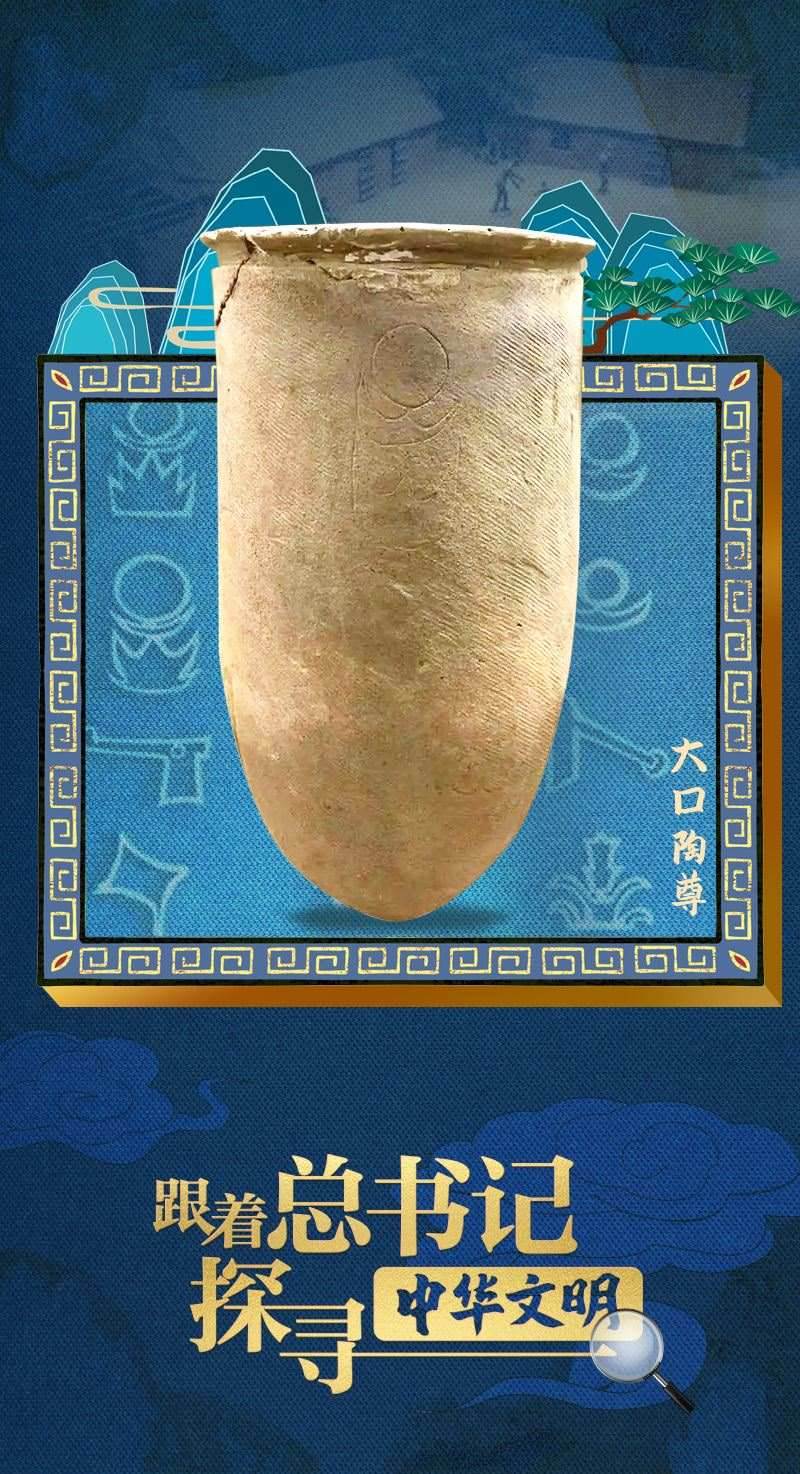 2023年6月2日,習近平總書記來到中國歷史研究院考察調研。展廳內,總書記沿“歷史大道”前行,仔細詢問最新考古發(fā)掘成果和文物展品保護情況。講解員指著一件陶器展品向總書記介紹:“這是一件出土于安徽蒙城新石器時代尉遲寺遺址的大口陶尊,距今大約4800年?!笨倳浽儐枺骸爸袊鞘澜缟咸掌髌鹪醋钤绲膰覇??”