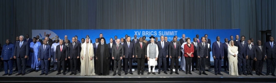 會議由南非總統(tǒng)拉馬福薩主持,巴西總統(tǒng)盧拉、印度總理莫迪、俄羅斯總統(tǒng)普京(線上)和60多位非洲國家及其他新興市場和發(fā)展中國家領導人或代表,以及聯(lián)合國秘書長古特雷斯、新開發(fā)銀行行長羅塞夫等國際和地區(qū)組織負責人出席。這是與會領導人集體合影。新華社記者 李學仁 攝