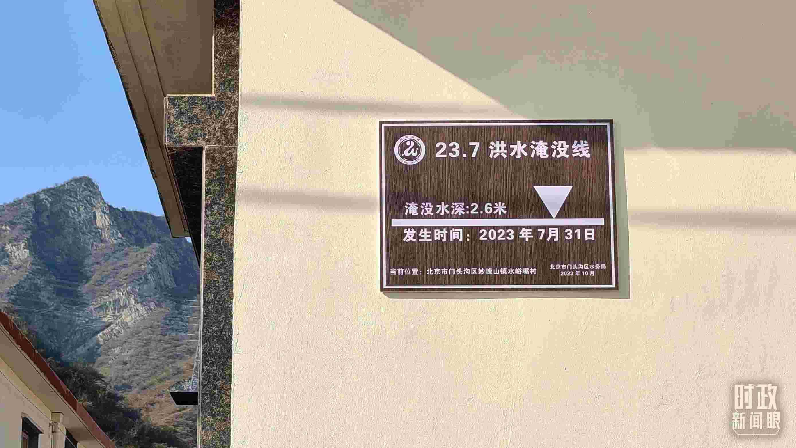 △ 村民房屋外設(shè)立了洪水淹沒線的標牌。(總臺央視記者賈林拍攝)