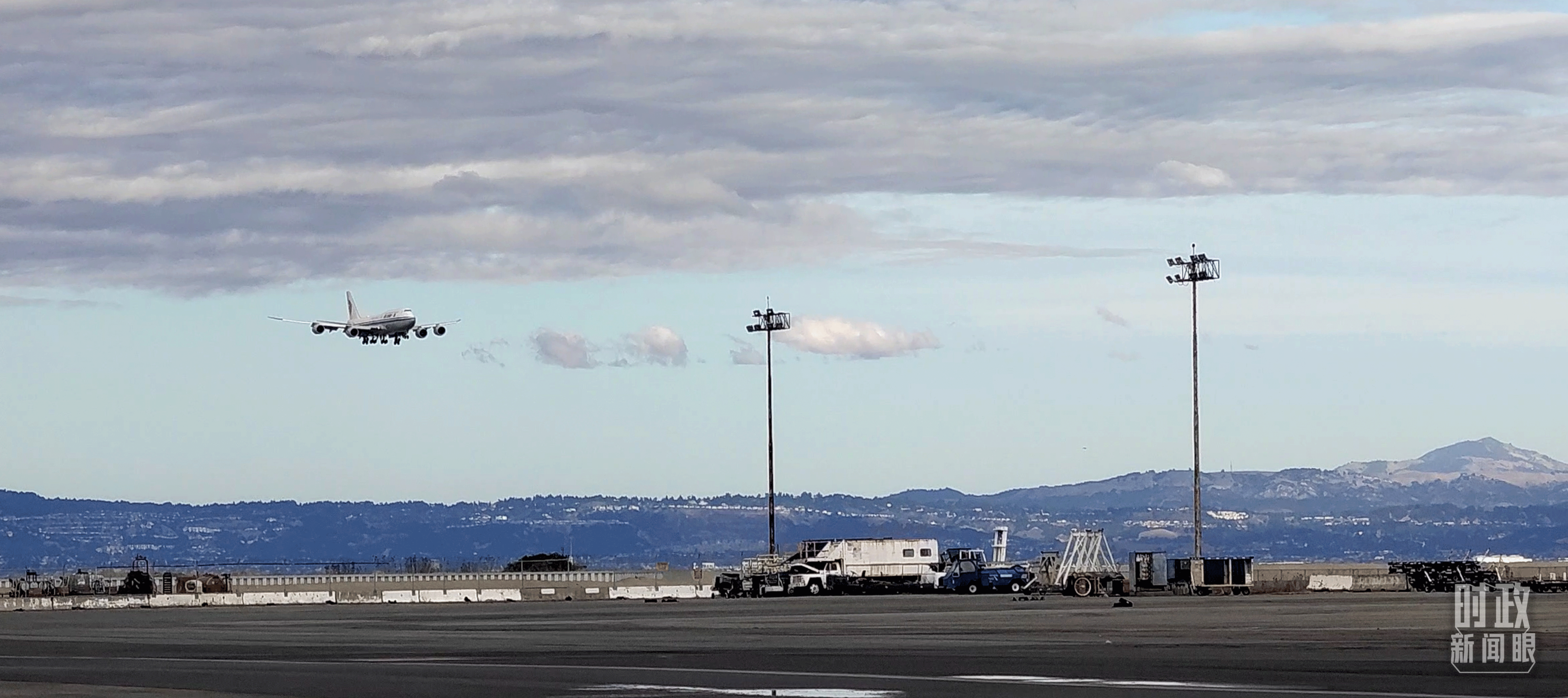 △習(xí)近平乘坐的專機(jī)即將降落舊金山國(guó)際機(jī)場(chǎng)。(總臺(tái)央視記者張曉鵬拍攝)