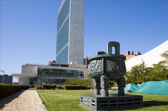 這是2015年9月15日在美國紐約聯(lián)合國總部拍攝的“世紀(jì)寶鼎”?!笆兰o(jì)寶鼎”是中國在1995年聯(lián)合國成立50周年之際,贈送給聯(lián)合國的禮物。新華社記者 李木子 攝