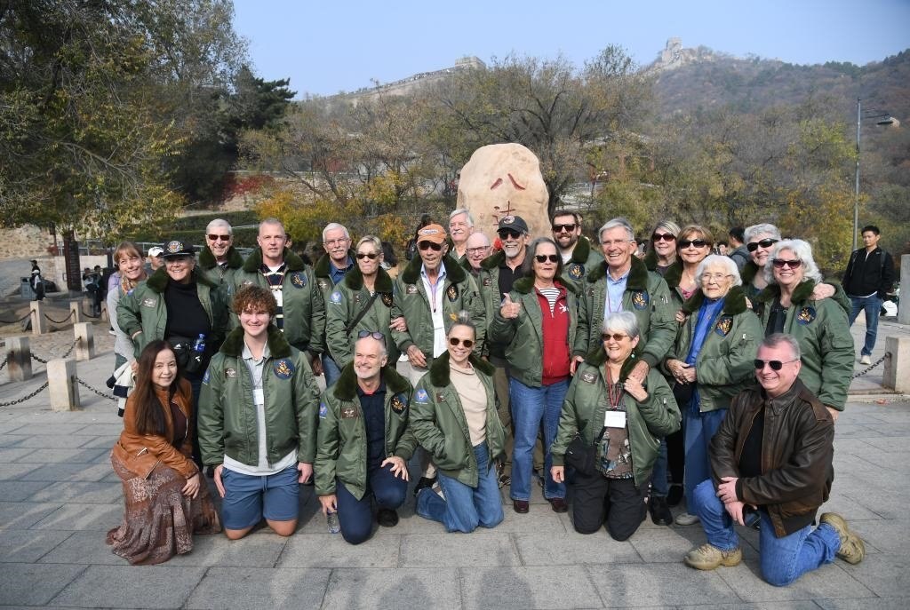 2023年10月29日,飛虎隊老兵莫耶一行人在北京八達(dá)嶺長城合影留念。當(dāng)日,美中航空遺產(chǎn)基金會訪華代表團(tuán)成員陸續(xù)抵達(dá)北京。新華社記者 任超 攝