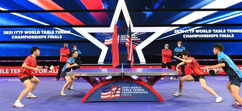 這是中美混雙組合在2021年11月下旬舉行的休斯敦世界乒乓球錦標(biāo)賽期間合練。中美選手在休斯敦世乒賽上聯(lián)合組隊出戰(zhàn)混合雙打比賽,紀(jì)念中美“乒乓外交”50周年。新華社記者 吳曉凌 攝