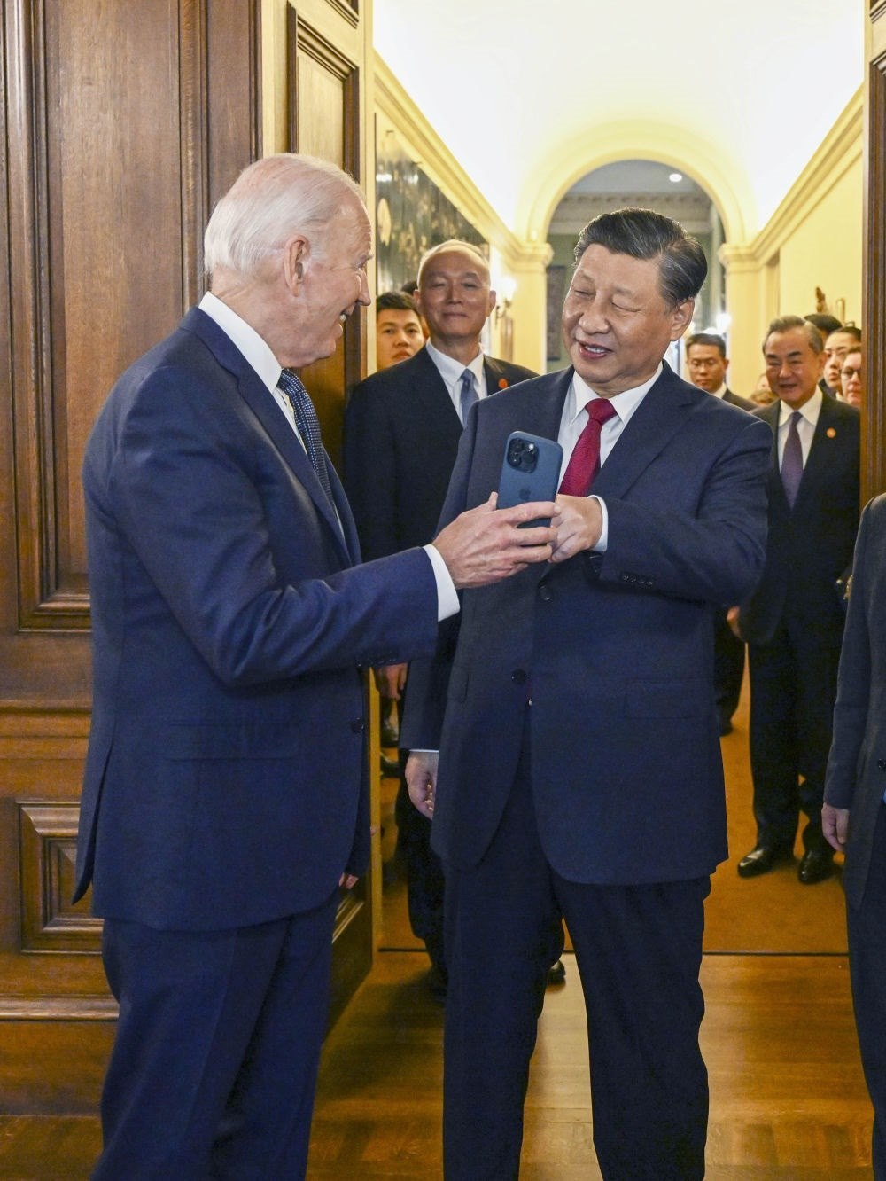 當(dāng)?shù)貢r間11月15日中午,美國舊金山郊外的斐洛里莊園,習(xí)近平主席結(jié)束同美國總統(tǒng)拜登的晤談,出席拜登總統(tǒng)舉行的宴會。這是拜登在手機上展示1985年習(xí)近平在擔(dān)任正定縣委書記時訪問舊金山的一張照片。新華社記者 李學(xué)仁 攝