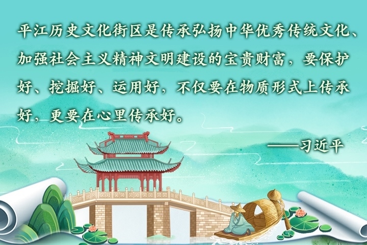 2023年7月6日上午,習(xí)近平總書(shū)記來(lái)到位于蘇州古城東北隅的平江歷史文化街區(qū)考察調(diào)研。他說(shuō):“住在這里很有福氣,古色古香,到處都是古跡、到處都是名勝、到處都是文化。‘百步之內(nèi),必有芳草’,這句話可以用在這里。”