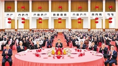 人民大會堂宴會廳燈光璀璨、喜氣洋洋,各界人士齊聚一堂、共迎新春,現(xiàn)場洋溢著歡樂祥和的節(jié)日氣氛。