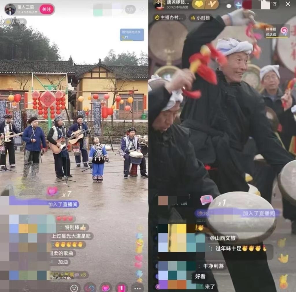 湖南省鳳凰縣臘爾山鎮(zhèn)苗寨中,4個“90后”苗族小伙組成樂隊自辦“村晚”,規(guī)模不大,唱火家鄉(xiāng);山西臨汾的村民們用簸箕、黃豆當樂器,配合嗩吶和非遺晉南威風鑼鼓,直播連線上千公里外的苗鄉(xiāng),南北大聯(lián)歡釋放獨特的精彩,吸引在線觀眾近800萬人……