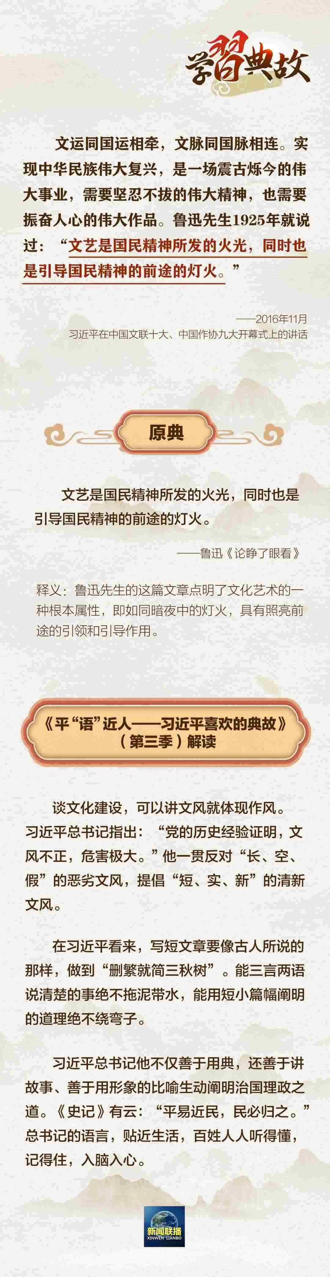 文運(yùn)同國(guó)運(yùn)相牽,文脈同國(guó)脈相連。文化自信是一個(gè)國(guó)家、一個(gè)民族發(fā)展中,最基本、最深沉、最持久的力量。黨的二十大報(bào)告中指出:“全面建設(shè)社會(huì)主義現(xiàn)代化國(guó)家,必須堅(jiān)持中國(guó)特色社會(huì)主義文化發(fā)展道路?!眹@“文化建設(shè)”這一主題,總書記曾講到哪些典故?一起學(xué)習(xí)↓↓↓