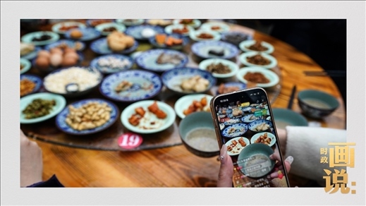 △游客用鏡頭記錄下豐盛的擂茶“壓桌菜”。2009年,擂茶習俗列入第三批“湖南省非物質(zhì)文化遺產(chǎn)代表性項目名錄”。