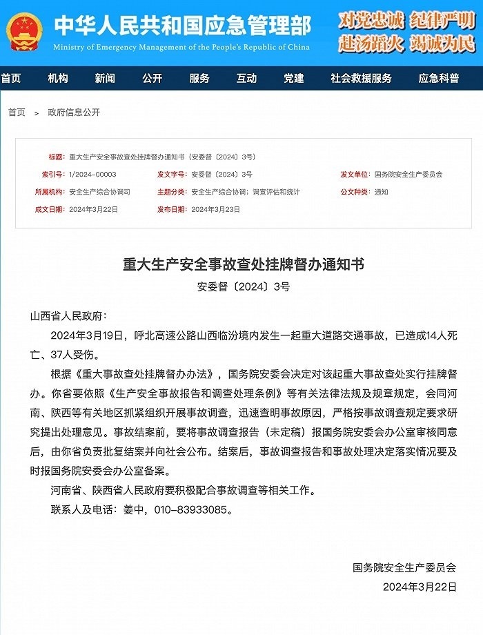 央視網(wǎng)消息:據(jù)應(yīng)急管理部網(wǎng)站消息,國務(wù)院安全生產(chǎn)委員會3月22日發(fā)布《重大生產(chǎn)安全事故查處掛牌督辦通知書》,2024年3月19日,呼北高速公路山西臨汾境內(nèi)發(fā)生一起重大道路交通事故,已造成14人死亡、37人受傷。根據(jù)《重大事故查處掛牌督辦辦法》,國務(wù)院安委會決定對該起重大事故查處實(shí)行掛牌督辦。