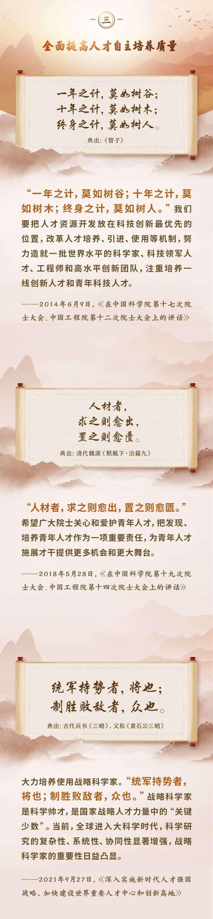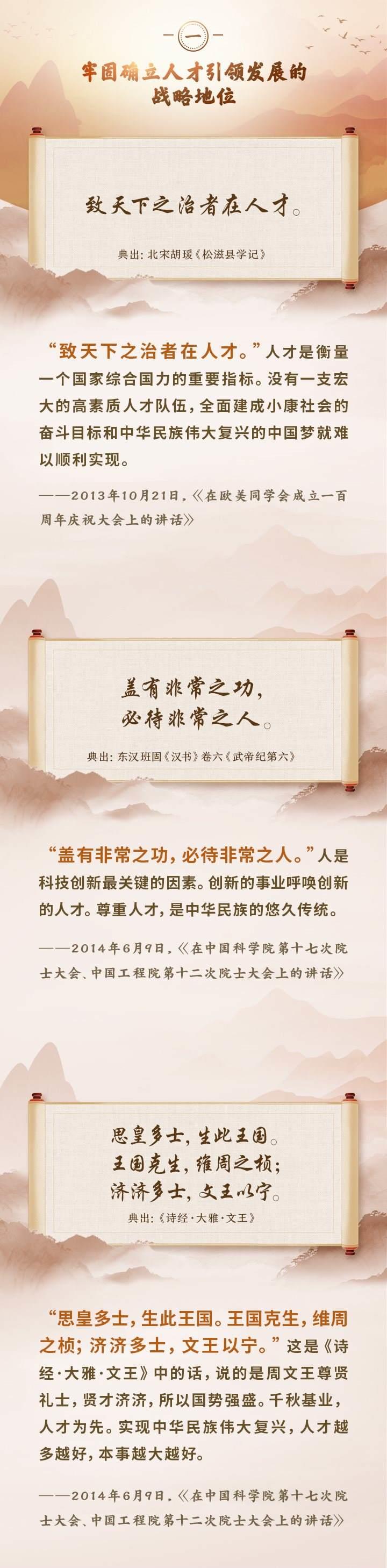 編者按:培養(yǎng)造就大批德才兼?zhèn)涞母咚刭|(zhì)人才,是國(guó)家和民族長(zhǎng)遠(yuǎn)發(fā)展大計(jì)。黨的十八大以來(lái),習(xí)近平總書(shū)記圍繞人才工作發(fā)表一系列重要論述,立意高遠(yuǎn),內(nèi)涵豐富,思想深刻,深刻回答了為什么建設(shè)人才強(qiáng)國(guó)、什么是人才強(qiáng)國(guó)、怎樣建設(shè)人才強(qiáng)國(guó)的重大理論和實(shí)踐問(wèn)題。在這些重要論述中,總書(shū)記精妙運(yùn)用古代典籍、經(jīng)典名句,以古喻今、啟迪思想、激蕩精神,讓我們一起來(lái)學(xué)習(xí)!