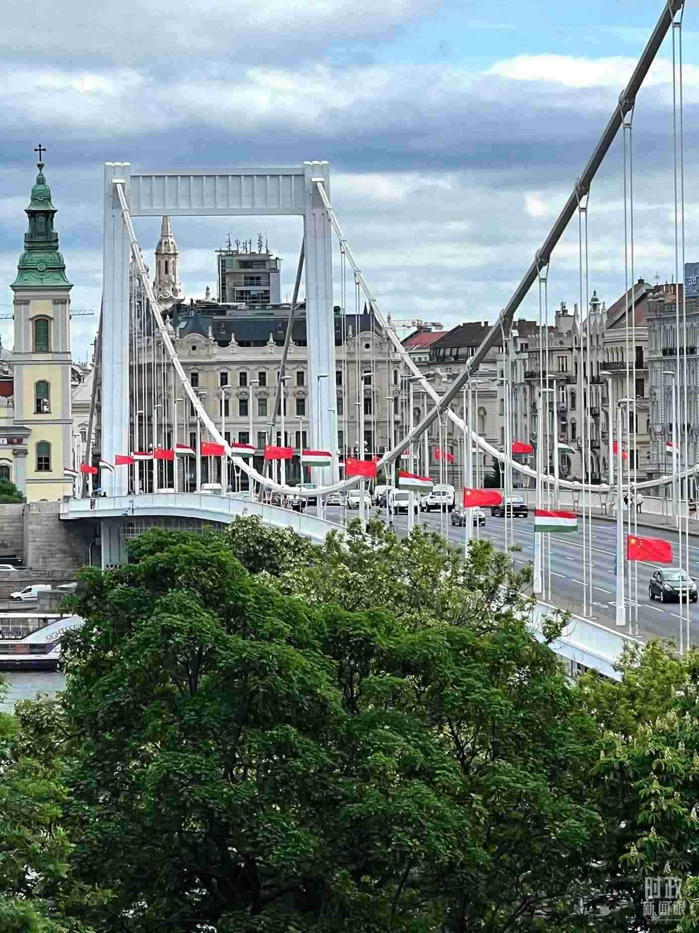△懸掛中匈兩國國旗的布達佩斯伊麗莎白大橋。(總臺央視記者石偉明拍攝)
