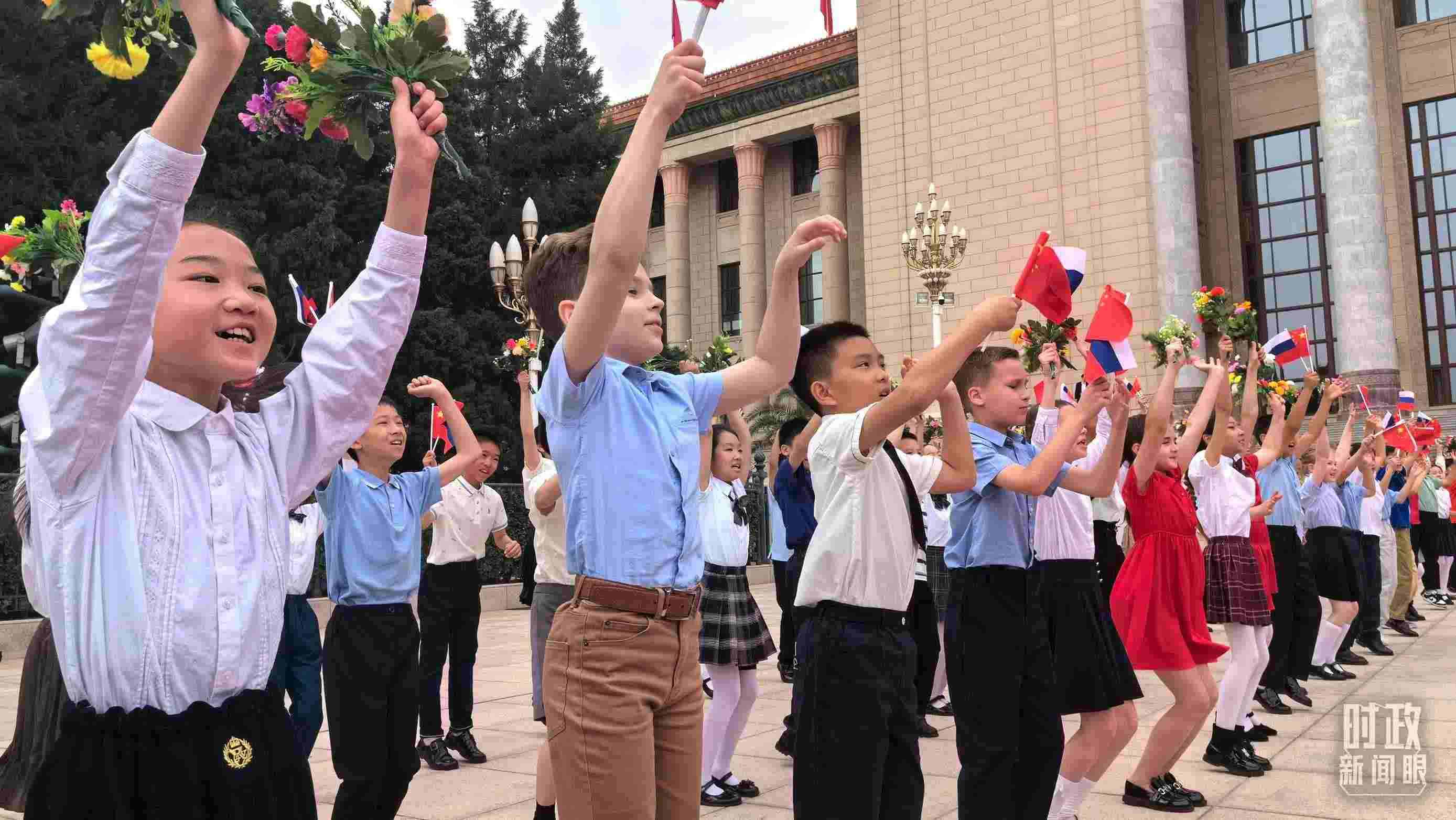 △歡迎儀式現(xiàn)場的中俄少年兒童。(總臺央視記者王子杭、段德文拍攝)