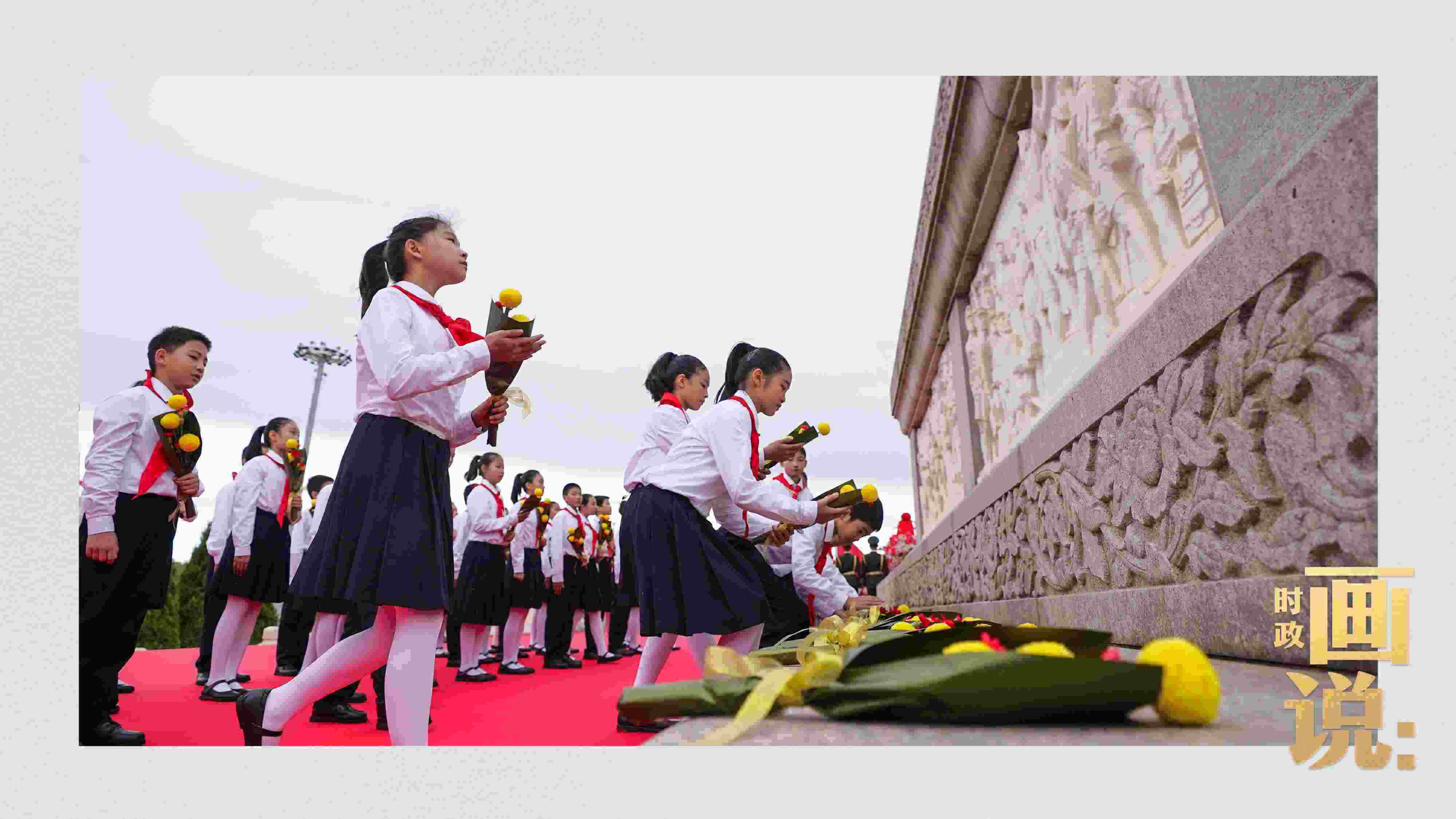 △少年兒童和各界代表依次走到紀(jì)念碑前,獻上手中鮮花并瞻仰紀(jì)念碑。