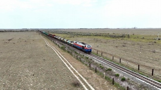 2023年5月12日,在哈薩克斯坦阿拉木圖附近,貨運(yùn)列車馳騁于阿拉木圖與中國(guó)霍爾果斯間(無(wú)人機(jī)照片)。新華社發(fā)(奧斯帕諾夫攝)