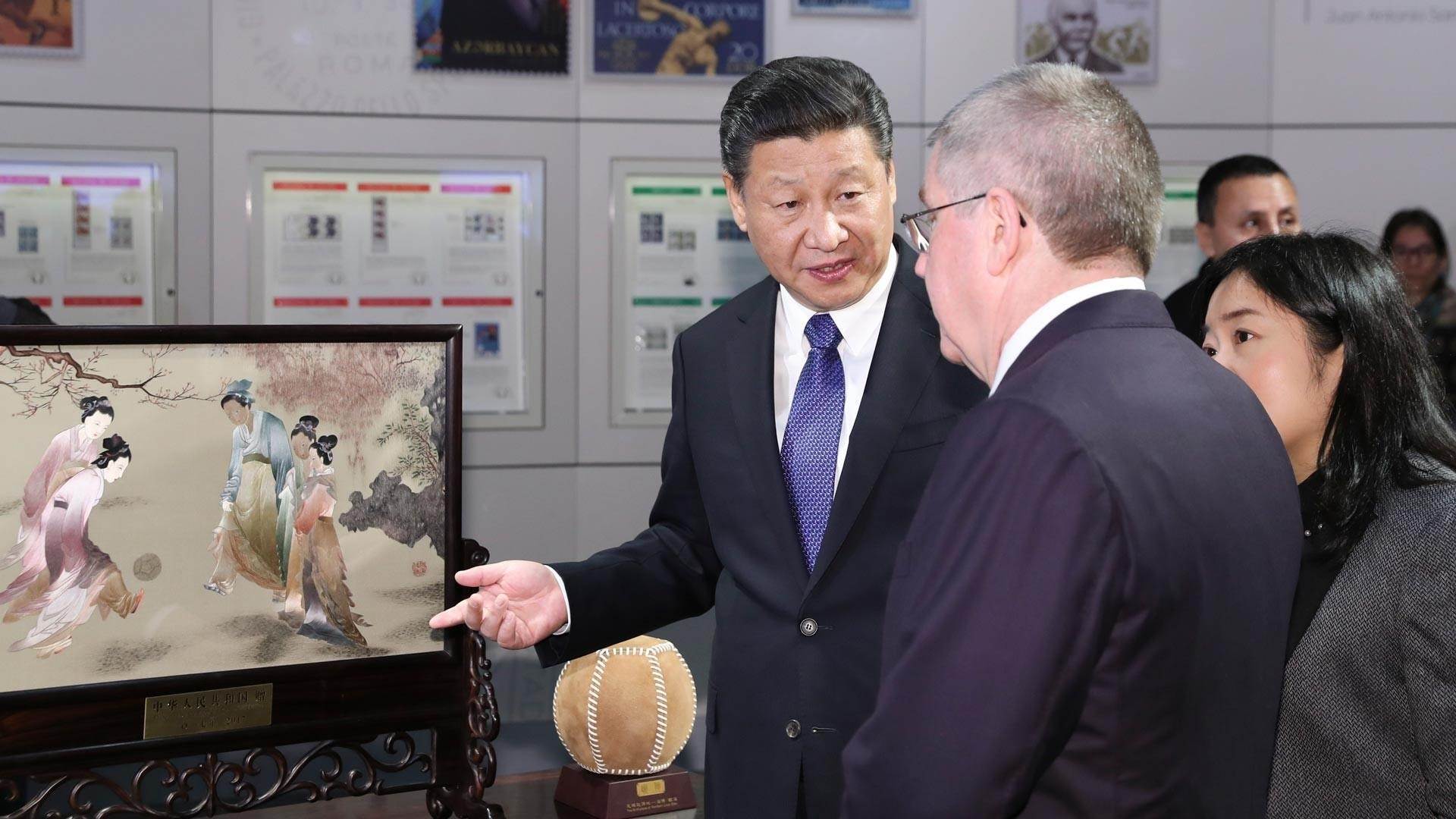 2017年1月,習(xí)近平主席在訪問(wèn)瑞士期間專程來(lái)到坐落在洛桑半山腰的國(guó)際奧林匹克博物館。這是中國(guó)國(guó)家元首首次到訪。習(xí)近平主席代表中國(guó)向國(guó)際奧委會(huì)贈(zèng)送了蘇繡《仕女蹴鞠圖》,并在留言簿上用中文寫(xiě)下:“弘揚(yáng)奧運(yùn)精神,促進(jìn)和平發(fā)展”。