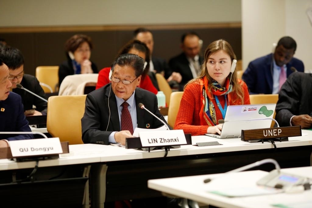 2019年4月18日,在位于紐約的聯合國總部,林占熺(前排中)在“菌草技術:‘一帶一路’倡議對促進落實聯合國2030年可持續(xù)發(fā)展議程的實質性貢獻”專題研討會上發(fā)言。新華社記者 李木子 攝