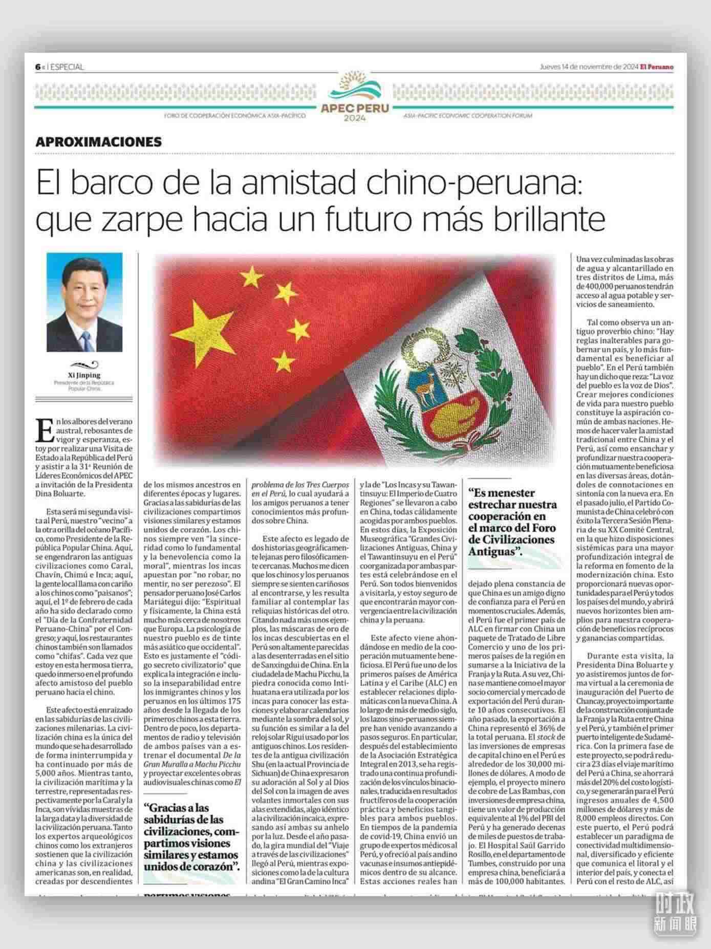 △習(xí)主席在《秘魯人報(bào)》發(fā)表題為《讓中秘友好之船揚(yáng)帆遠(yuǎn)航》的署名文章。(總臺國廣記者吳倩)