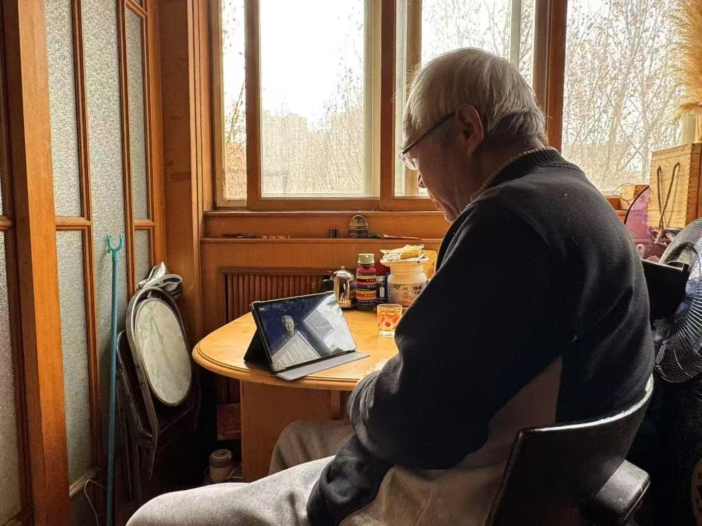 2025年1月26日,天津市南開區(qū)的老人崔金海正在同小云健康陪伴智能機中的虛擬“同伴”聊天。新華社記者 梁姊 攝