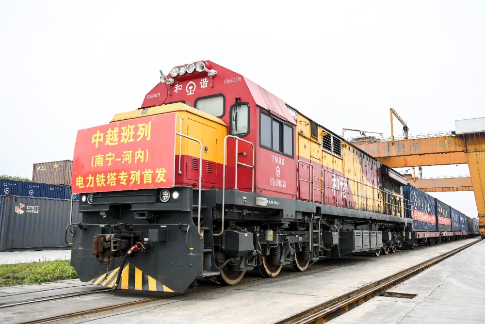 2024年3月8日,在廣西南寧國(guó)際鐵路港,電力鐵塔專列準(zhǔn)備發(fā)車。當(dāng)日,一列滿載340噸電力鐵塔的中越班列從南寧國(guó)際鐵路港開(kāi)出,發(fā)往越南河內(nèi)。新華社記者 曹祎銘 攝
