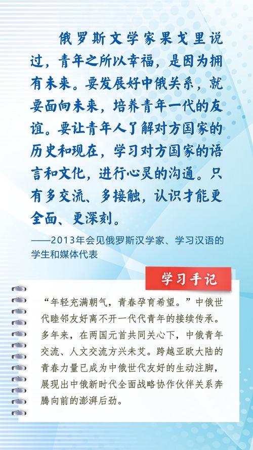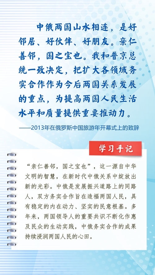中華民族和俄羅斯民族都有悠久的歷史、古老的文明、燦爛的文化,都是偉大的民族。近年來(lái),習(xí)近平主席常常引用中國(guó)詩(shī)詞古語(yǔ)、俄羅斯諺語(yǔ)名言等,寄語(yǔ)中俄關(guān)系發(fā)展和全人類(lèi)和平與發(fā)展。這些重要論述,蘊(yùn)含對(duì)文明、歷史的深邃思考,指引著新時(shí)代的中俄關(guān)系不斷向前,為世界百年變局中的人類(lèi)文明進(jìn)步事業(yè)指明方向。