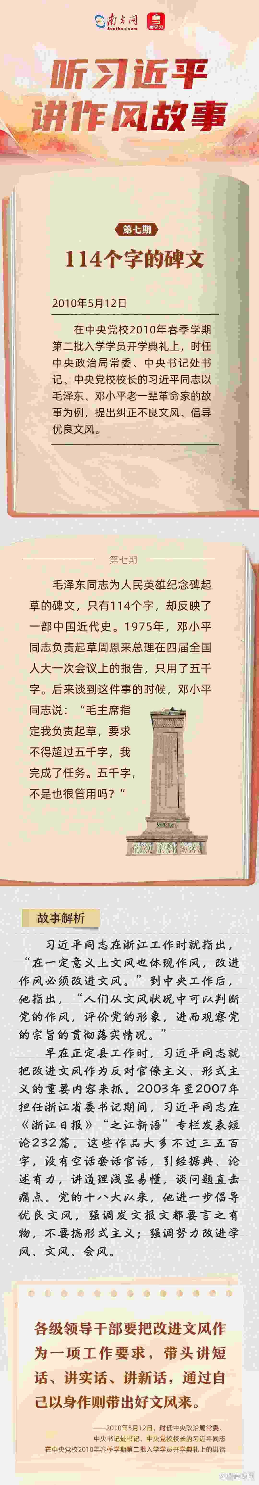 當(dāng)前,全黨上下正在開(kāi)展深入貫徹中央八項(xiàng)規(guī)定精神學(xué)習(xí)教育,縱深推進(jìn)作風(fēng)建設(shè)。關(guān)于作風(fēng)建設(shè),習(xí)近平總書(shū)記常用講故事的方式,傳達(dá)深意、感染他人,給人以思想啟迪。南方網(wǎng)、粵學(xué)習(xí)客戶(hù)端推出“聽(tīng)習(xí)近平講作風(fēng)故事”系列報(bào)道,與您一起感悟這些故事蘊(yùn)含的深刻道理。 今天,推出《聽(tīng)習(xí)近平講作風(fēng)故事⑦丨114個(gè)字的碑文》,與您一起學(xué)習(xí)毛澤東、鄧小平老一輩革命家的文風(fēng)。