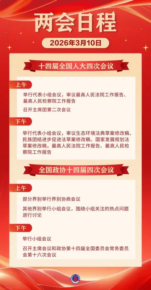 兩會(huì)日程預(yù)告丨3月10日:人代會(huì)審議“兩高”工作報(bào)告等 政協(xié)舉行界別協(xié)商會(huì)議和小組會(huì)議