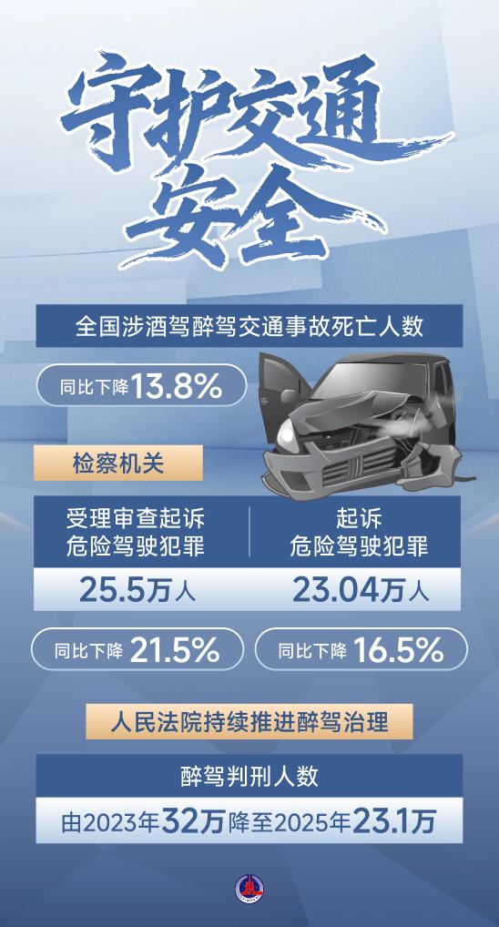 最高法報(bào)告指出,辦理醉駕刑事案件意見(jiàn)出臺(tái)后,判刑人數(shù)由2023年32萬(wàn)降至2025年23.1萬(wàn),因酒駕造成交通事故及致死、致傷數(shù)量均有下降。同時(shí),明確“駕駛?cè)俗砭坪髥⒂幂o助駕駛功能仍應(yīng)承擔(dān)刑事責(zé)任”?! ?/p>