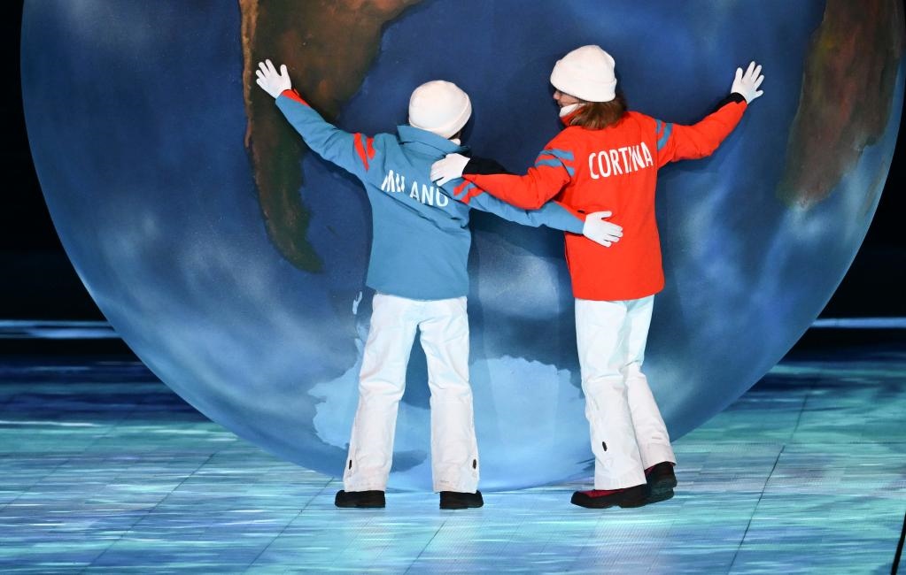 2月20日晚,北京第二十四屆冬季奧林匹克運動會閉幕式在國家體育場舉行。圖為下屆冬奧會舉辦城市意大利米蘭與科爾蒂納丹佩佐文藝表演“雙城璧合·聚力聯(lián)輝”環(huán)節(jié)。新華社記者李尕攝