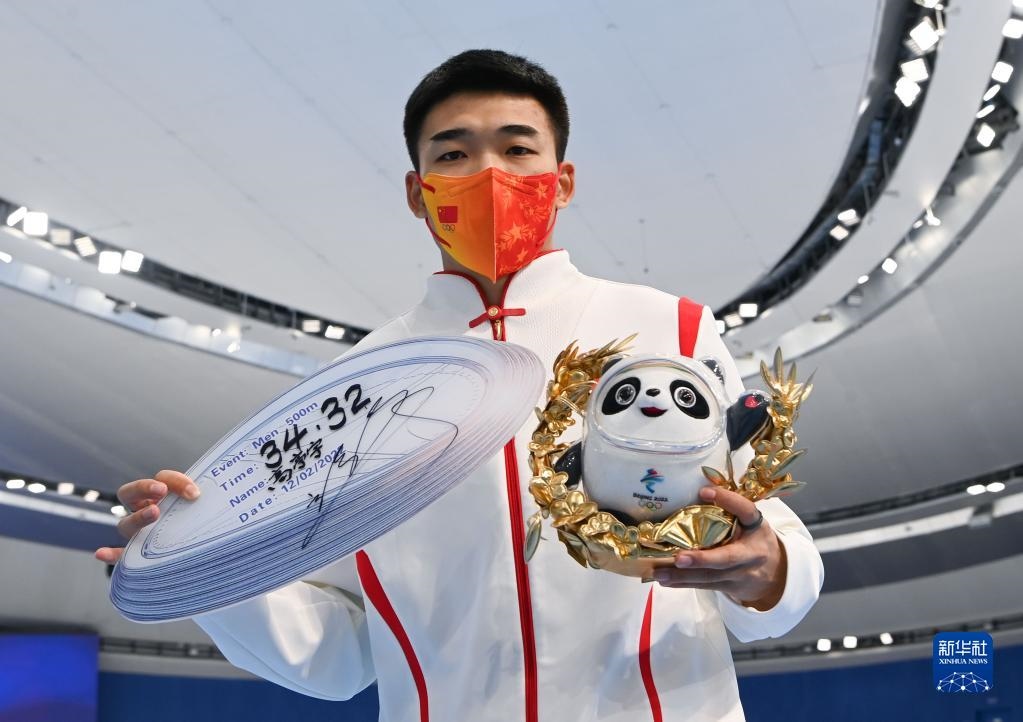 2月12日,冠軍中國隊(duì)選手高亭宇展示自己在速度滑冰男子500米決賽中的成績。新華社記者武巍攝