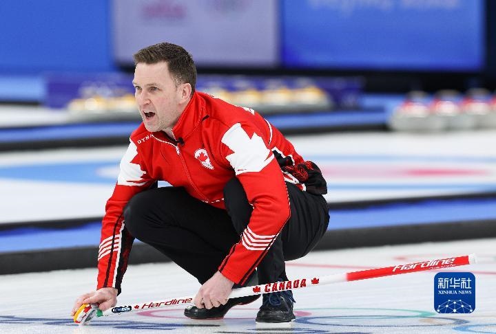 2月18日,加拿大隊(duì)選手布拉德·古休在冰壺男子銅牌賽比賽中。新華社記者王婧嬙攝