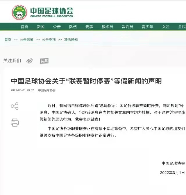 “近日,有網(wǎng)絡(luò)自媒體曝出所謂‘(體育)總局指示:國(guó)足各級(jí)聯(lián)賽暫時(shí)停賽,制定規(guī)劃’等消息。中國(guó)足協(xié)確認(rèn),包含該消息在內(nèi)的相關(guān)文章內(nèi)容均為杜撰。對(duì)于這種憑空捏造假新聞的惡劣行為,我會(huì)表示譴責(zé)!”中國(guó)足協(xié)在聲明中說。